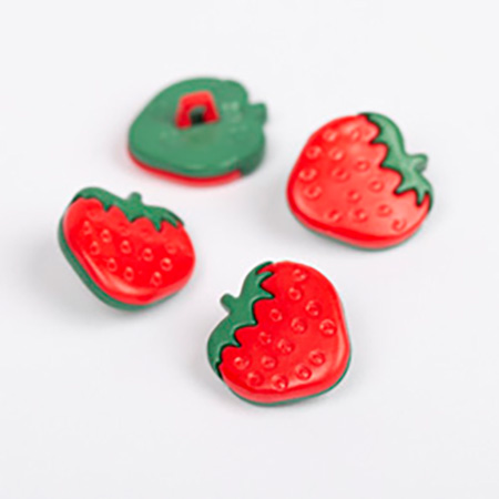 Braškės formos sagos, pagamintos iš poliamido (plastiko). Sagos apačioje yra skylutė-kilpelė, todėl pritvirtinus nesimato siūlų. Galima skalbti skalbimo mašinoje, 30°C temperatūroje.